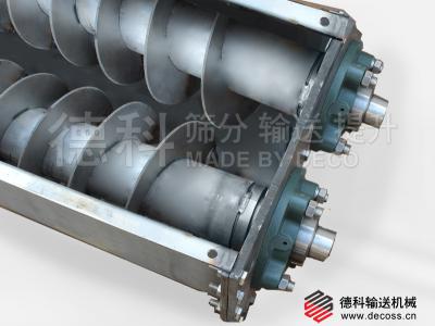 雙軸螺旋輸送機(jī)基于LS螺旋輸送機(jī),是在U型槽內(nèi)分別裝有一根實(shí)體螺旋,其中一根是左旋,另一根是右旋。工作時(shí)兩根螺旋通過(guò)在軸伸位置的一對(duì)齒輪嚙合轉(zhuǎn)動(dòng),由于螺旋體的轉(zhuǎn)動(dòng),使物料作軸向移動(dòng),從而達(dá)到輸送目的。